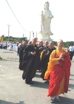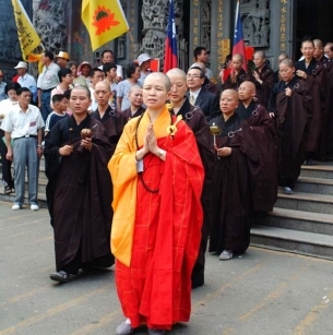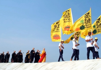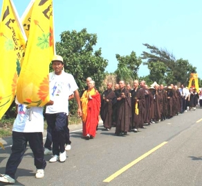 91.7.27 灑淨已迄,法師們前導聖像步出甘泉寺門。