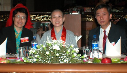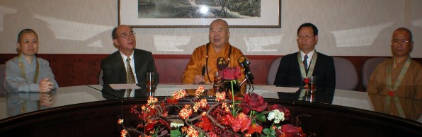 2002.04.15 星雲大師召開「恭迎佛指舍利圓滿記者會」。左起昭慧法師、吳伯雄、星雲大師、廖正豪。 |