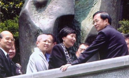 2002.04.07 前「自由時代」雜誌社負責人鄭南榕在十三年前,為爭取言論自由而自焚,陳總統上午在台北縣金寶山墓園為紀念鄭南榕的「自由之翼」紀念碑揭碑。 |