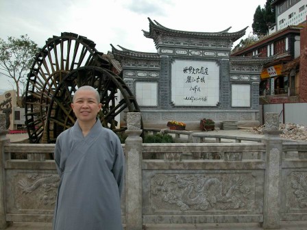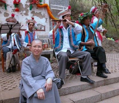 2003.04.16 於蝴蝶泉遇見白族歌舞表演,昭慧法師乃於樂師前之台階坐下,攝影留念。 |