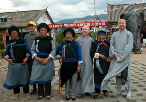 2003.04.17 返回昆明途中,參觀慶賀縣新華民族旅遊村,與白族老婦人洪福秀女士(左三)等合影留念(左二:道堅法師)。 |