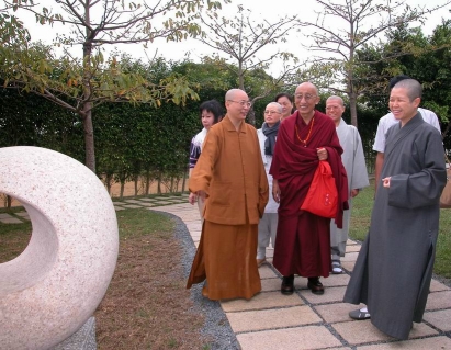 2003.11.24 西藏流亡政府審計總署署長,第四世久美倫珠仁波切(中),在五眼護盲協會創會會長蓮懺法師(左)陪同下蒞院參觀。 |