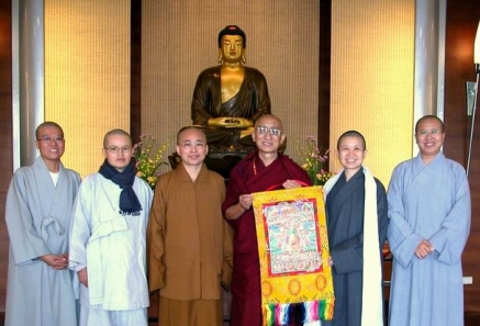 2003.11.24 久美倫珠仁波切致贈西藏佛畫(左二:雲如法師,左一:東蓮法師)。 |