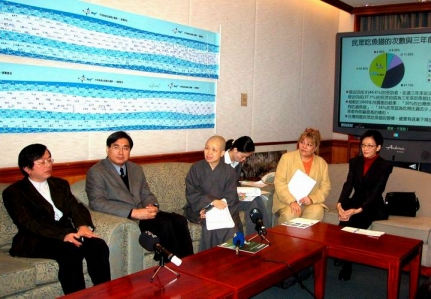 2003.11.25 譴責濫捕鯊魚「割鰭棄身」記者會出席人士(左一:羅文坤教授,左二:楊憲宏先生,右一:胡因夢小姐,右二: susie watts小姐)。 |