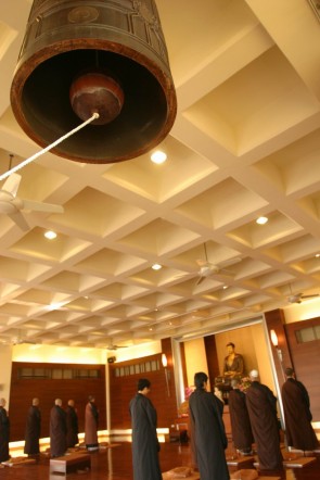 2004.02.28 下午二時二十八分,本院住眾一同在大殿中敲響和平鐘一○八下,並同聲唱誦「扣鐘偈」。 |