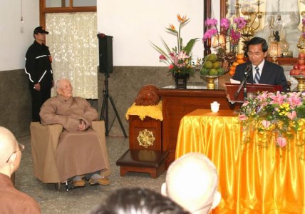 2004.03.05 導師浙江鄉音濃厚,昭慧法師乃趨前為總統翻譯導師的致詞內容。 |