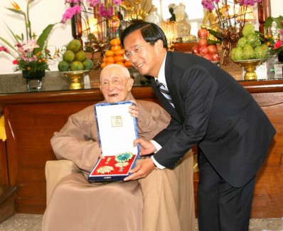 2004.03.05 總統俯身為印順導師頒贈二等卿雲勳章。 |