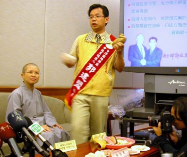 2004.06.10 高雄市議員候選人郭建盟先生(中立者)擔任「揭發黑心素食」記者會主持人。 |