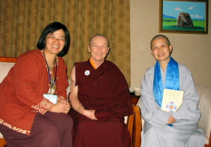 2008.7.3 晚間,ven. leksha tsomo(中)在李玉珍教授與張玉玲教授(左)的陪同下,特別到昭慧法師房間送別。 |