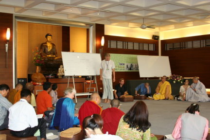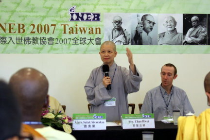 96.9.1 與昭慧法師以「緣起、護生、中道-佛教倫理學與戒律學的系統理論」為題發表主題演講(右:第一次全體會議的另一位主席david reid)。 |