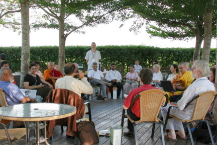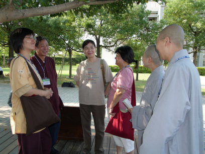 96.9.1 四位英譯高手(左起:張玉玲、游祥洲、李素卿、李玉珍)與昭慧、性廣法師在慈暉台上笑談愉快。 |