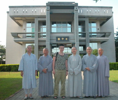 96.9.14 為幫助尼泊爾婦女而成立綠度母基金會的英籍ineb成員karunamati(左三)今日離台,行前與學團師生合影(左起二人:彰妙、心謙;右起二人:融德、明一)。 |