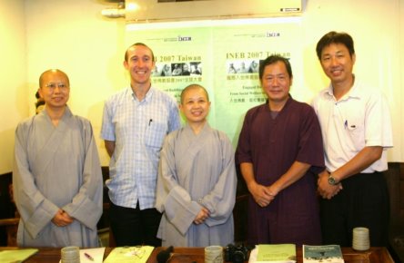96.8.29 ineb 2007記者會會後合影(左起:性廣法師、david reid、昭慧法師、游祥洲教授、張文瑲董事長)。 |