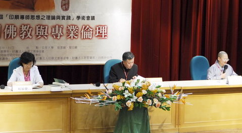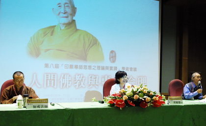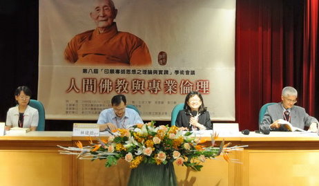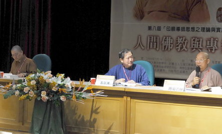 98.5.30 第一場綜合座談會(右起:引言人傳道法師,主持人游祥洲教授,引言人見岸法師)。 |