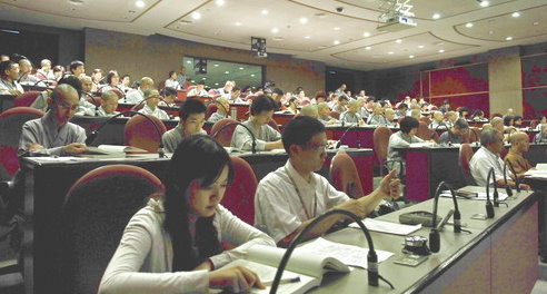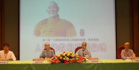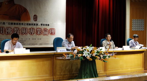 98.5.31 聖印廳第三場論文研討會。(右起:發表人印隆法師,主持人性廣法師,發表人德涵法師、程進發教授)。 |
