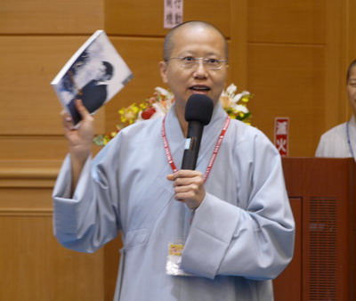98.5.31 第二場綜合座談會,性廣法師起來發表感言,讚嘆昭慧法師、何日生教授堪為「菩薩三昧」之典範。 |