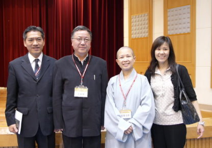 98.5.31 閉幕典禮後,與會學者、來賓合影。(左起:何日生教授、王雷泉教授、昭慧法師、前現代禪基金會秘書長華敏慧女士)。 |