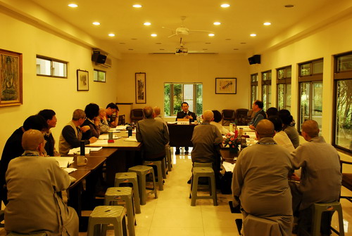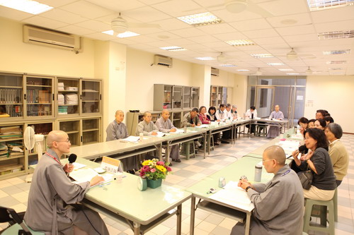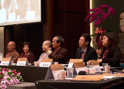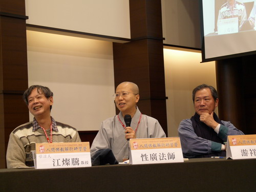 99.4.18 學者們睿智且幽默的發言,讓圓桌會議上的討論相當熱烈(左起:江燦騰教授、性廣法師、游祥洲教授)。 |