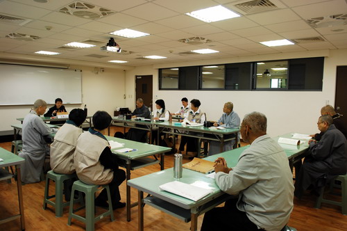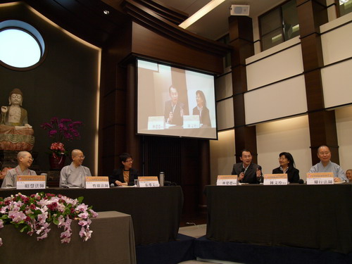 99.4.18 林建德教授發言(左起:昭慧法師、性廣法師、張瓈文教授、林建德教授、陳文玲教授、耀行法師)。 |