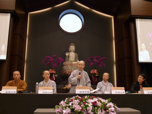 99.4.18 昭慧法師主持綜合報告,由各分論壇主持人報告該組討論情形(左起:如戒法師、清德法師、昭慧法師、性廣法師、張瓈文教授)。 |