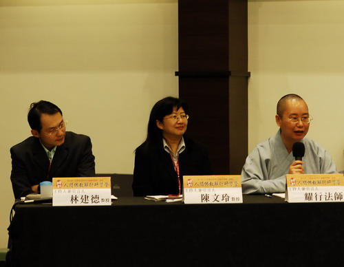 99.4.18 耀行法師發言(左起:林建德教授、陳文玲教授)。 |
