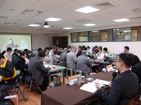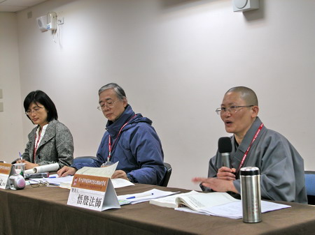 2011.3.12 b廳場次第一場論文研討會(右起:發表人悟殷法師、主持人顏尚文教授、發表人陳玉女教授)。 |