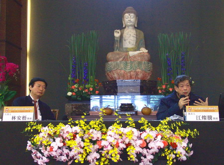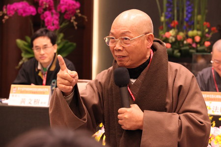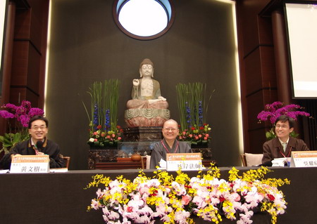 2011.3.12 a廳場次第二場論文研討會(右起:許清原教授代吳耀庭教授發表、主持人見岸法師、發表人黃文樹教授)。 |
