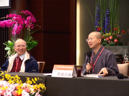 2011.3.13 第二場新書發表會,由李瑞全教授(左)主持,性廣法師(右)發表《圓頓止觀探微》。 |