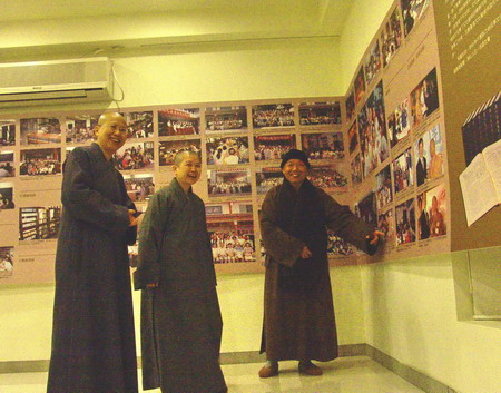 2011.3.11 11日晚間於嵐園,傳道法師為昭慧、性廣法師導覽「凡夫菩薩的入世關懷與淨化──傳道法師七十回顧展」。 |