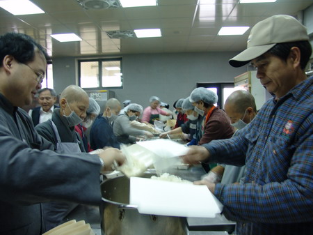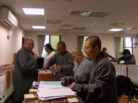 2011.3.11 會議前一天(11日)下午,文書組組長心宇法師(右)率領志工分裝資料袋。 |