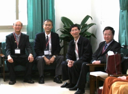 95.5.20 蒞會的教授們在貴賓室茶敘(左起:玄奘大學鍾瑞國校長、玄奘大學文理學院黃清連院長、江南大學鄧子美教授與復旦大學王雷泉所長)。 |