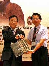 95.5.20 林博文副校長(右)致贈禮品給與會學者,由王雷泉教授代表受贈。 |