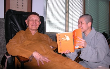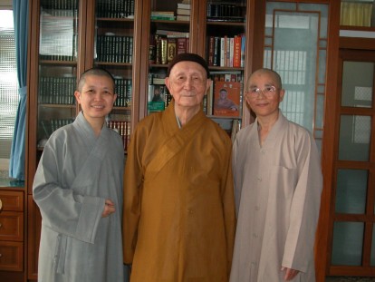 91.04.23. 導師壽誕前夕,與侍者明聖法師、昭慧法師合影於華雨精舍。