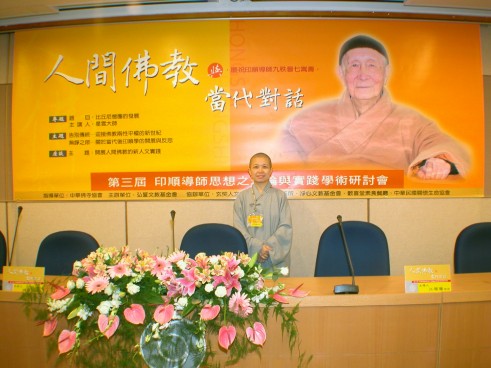 91.04.21. 昭慧法師於祝壽研討會場主席台。