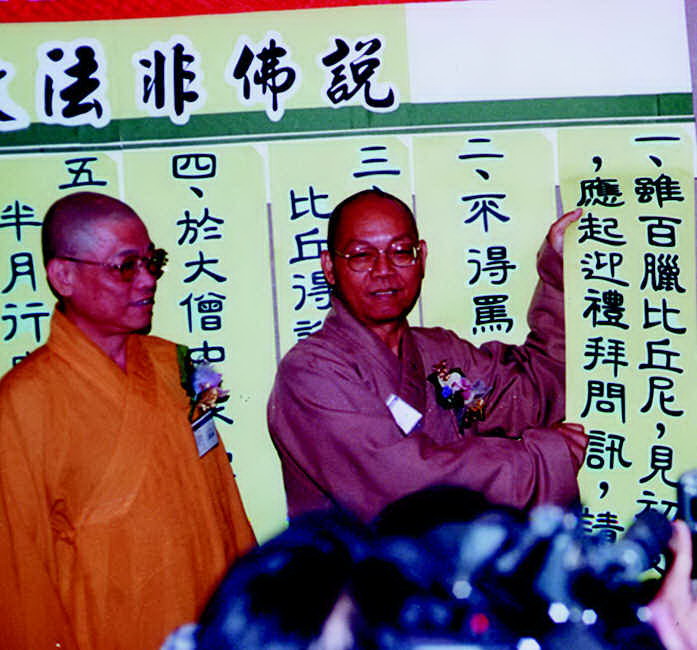 90.3.31 傳道法師撕揭第一條八敬法條文(左:文德法師)。 |