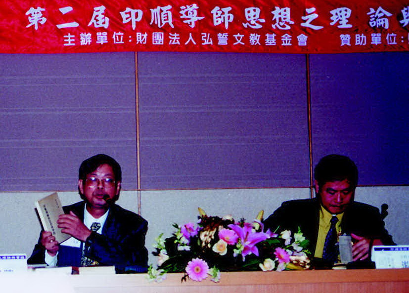 90.3.31 第二場悟殷法師發表新書《部派佛教系列(上編)》、昭慧法師發表新書《初期唯識思想》。(左起:回應人郭忠生老師、發表人悟殷法師、主持人黃崧修老師、發表人昭慧法師、回應人陳一標老師)。 |