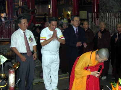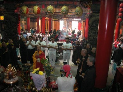2004.07.31 桃園縣蓮花季,鄉民向觀音聖像獻上「土地八吉祥」。 |