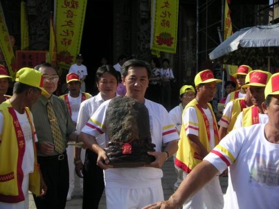 2004.07.31 桃園縣蓮花季,在演淨之後,舉行海岸巡禮時,張鄉長在代表鄉民誦祈願文,信眾代表獻上土、石、沙、貝、花、草、種子、水等「八吉祥」。10時返駕甘泉寺前廣場安座,隨即舉行午供大典,副縣長黃敏恭、立委邱垂貞、郭榮宗與鄉長張永輝等人,以及台電、中油代表均隨法師虔誠上香。請聖(鄉長恭捧聖像走出甘泉寺)。 |