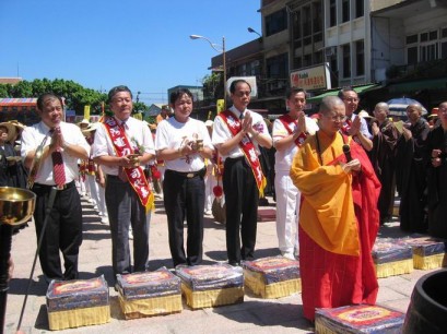 2004.07.31 桃園縣蓮花季,午供大典(後排右一至右三:曾獻奉主委、張永輝鄉長、黃敏恭副縣長)。 |