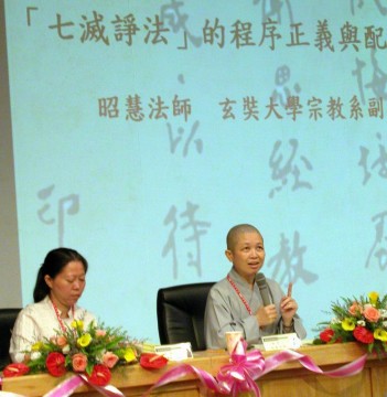 2004.09.26 現代佛教學會為慶祝印順導師百歲嵩壽,特於25、26兩日,在台灣大學舉行「佛教文化與當代世界」學術研討會。本日為第二日,上午,昭慧法師赴會發表論文〈「七滅諍法」的程序正義與配套措施〉,獲得了熱烈的迴響。(左:主持人蕭麗華教授)。 |