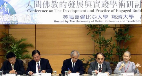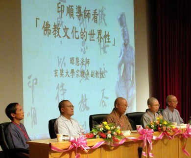 2004.09.26 在台灣大學舉行「佛教文化與當代世界」學術研討會,由傳道法師主持,恆清法師、昭慧法師、楊惠南教授與藍吉富教授依序擔任引言人,昭慧法師談導師對「發揚佛教文化以鼓鑄世界和平」之見地,並分析(右起:恆清法師、昭慧法師、傳道法師(主持人)、楊惠南教授與藍吉富教授)。 |