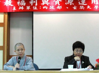 2004.11.14 於玄奘大學國際會議廳,玄奘大學宗教學系舉行第二屆「宗教福利與資源運用」學術研討會。(左:發表人傳法法師,右:主持人鄭弘岳教授)。 |