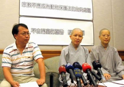 2004.11.04 關懷生命協會於立法院召開「宗教不應成為動物保護法的化外之區」記者會,昭慧、傳法法師與協會董事林雅哲醫師出席發言,針對最近盧博基立委擬修訂動保法,增列限制放生條文,協會指出:宗教不應成為動物保護法的化外之區,除了宗教放生以外,宗教神豬、宗教狩獵,整個過程涉及對動物很殘忍的部分,都應一併納入動物保護法規範。農委會在面對「宗教」所牽涉的保護動物爭議,不能再以「恐引起宗教界/客家族群/原住民強烈反彈」為由繼續當「縮頭烏龜」,而致令不合時宜的習俗繼續危害動物及環境生態。反對單就「放生」而立法,卻放過其他宗教不當習俗殘害動物的行為。認為這樣有違「宗教平等」之憲法精神。 發言人左起:林雅哲醫師,昭慧法師,傳法法師。 |