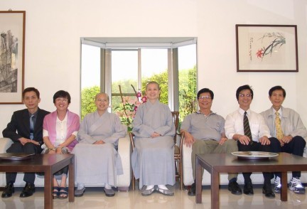 2004.11.09 瀚邦集團主持人曾梁源、黃麗明伉儷暨其兄弟曾梁華先生、大公子曾瀚霆副董事長、李顯昌副總經理以及黃亮熹、吳俊廷建築師,一行人蒞院參訪,昭慧、性廣法師與本基金會吳東霖律師伉儷、張章得董事、張麗雲董事共同接待訪客,並於午後在嵐園座談,初步溝通彼此之建築構想。有感於曾氏伉儷對校舍重建之小小工程,竟然如此鄭重其事,親自帶領核心幹部到臨此間,昭慧法師甚表感恩。曾梁源居士笑稱:「若是大工程,我一個人去洽談就夠了!」言談之間,感受得到彼等殷重護持本院之懇切心意,令本院師生無任銘感。 |