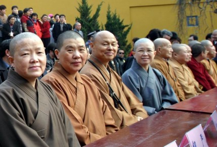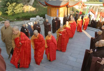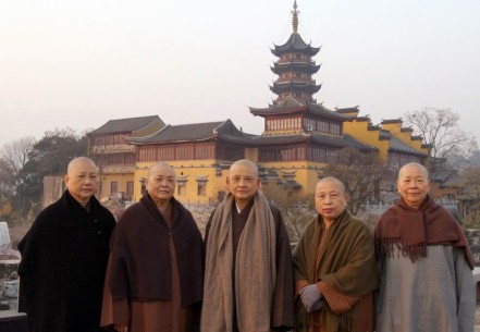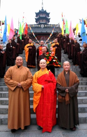 2004.12.09 上午,性廣法師續講菩薩戒。下午,前來擔任尼眾尊證之普暉、達瑩長老尼與修梵、真啟、真悅三位隨行弟子,與汐止彌勒內院監院法成法師,從臺灣飛抵南京,紹嚴法師前往接機,性廣法師等亦同行。雞鳴寺住持蓮華法師率尼眾戒子列隊為當日暨六日抵達南京之諸位尊證和尚尼與授經阿闍黎性廣法師,擊鼓鳴鐘,盛大接駕(性廣法師為了幫諸位長老尼留下此一歷史鏡頭,因此謙辭排在長老尼行列之中)。 |