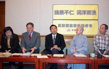 2004.12.23 陳建銘委員與關懷生命協會於立法院舉行「殘暴不仁,竭澤而漁」記者會。由於陳委員本次高票落選,關懷生命協會首先向陳委員致贈琉璃工房紀念品一座,並表彰他「為弱勢喉舌,為動物天使」。接下來舉行記者會,陳委員、昭慧法師與永續生態旅遊協會顧問賴鵬智先生,嚴詞譴責農委會「丹大林場開放狩獵」政策之殘暴不仁,竭澤而漁,並強烈要求收回成命。農委會保育組方國運組長主動到會婉言說明,但仍遭隆隆炮聲之反駁。記者會結束前,沈智慧委員趕到,她以一「吃齋念佛」者的立場,同樣堅決反對農委會之決策,並聲稱將看緊相關預算,令彼等動彈不得(左起:沈智慧委員、方國運組長、陳建銘委員、昭慧法師、賴鵬智先生)。 |