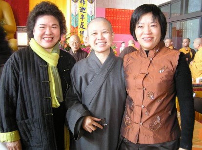 2004.12.31 中華佛寺文教會館落成啟用暨佛像開光典禮,行政院游錫?院長率領內政部蘇嘉全部長、勞委會陳菊主委、行政院陳其邁發言人與諸部會副首長一行人前來親自主持剪綵、啟鑰典禮。游院長致詞時,盛讚中華佛寺協會歷年獲得績優社團獎,對佛教與社會都卓有貢獻。昭慧法師接著致詞,表達佛寺協會對林蓉芝秘書長的甚深感恩(致詞內容〈四眾齊心的美好見證〉。於中華佛寺文教會館落成啟用暨佛像開光典禮後,勞委會陳菊主委(左)、佛寺協會林蓉芝秘書長(右)與昭慧法師合影)。 |