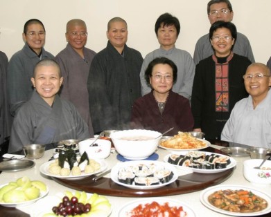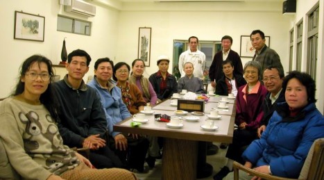 2005.02.03 連續兩天,學員陳文玲居士所帶來的日本友人中村町子女士(前坐中),特為學團煮味噌湯、製作壽司,並示範日本茶道;在文玲助理教學之下,大家熱心學習著日本茶道的每一步驟,極為有趣。中村町子女士在東京開貨運公司,對各國留學生非常照顧,而且熱心公益。陳文玲現為東京都立大學博士候選人,甚受其關照而成為摯友,故寒假期間帶她走訪台灣,並特參訪本院。日本友人中村町子女士與學團師生於嵐園茶敘(右立一為刻在日本留學的陳文玲居士)。 |