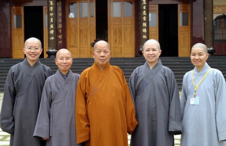 2005.01.30 學團師生至台南學甲法源寺,向住持開雲長老尼、監院開果長老尼禮座。南下參訪第一站,於學甲法源寺前廣場合影(左起:心住法師、心祥法師、開果長老尼、昭慧法師、圓承法師)。 |