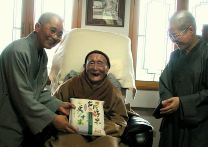 2005.02.14 清晨,學團師生十九人出發至花蓮,中午至七星潭海灘用餐,下午抵達靜思精舍,向印順導師、慧瑩長老尼與證嚴法師禮座、拜年。晚間至慈善寺,向達瑩長老尼禮座、拜年;慈善寺準備了非常豐盛的晚餐,並為一行人安排住宿。 向印順導師禮座、拜年,並代為奉上觀音文化工作陣理事長鍾添壟居士所供養之桃園特產「秀才米」(左:明聖法師)。 |